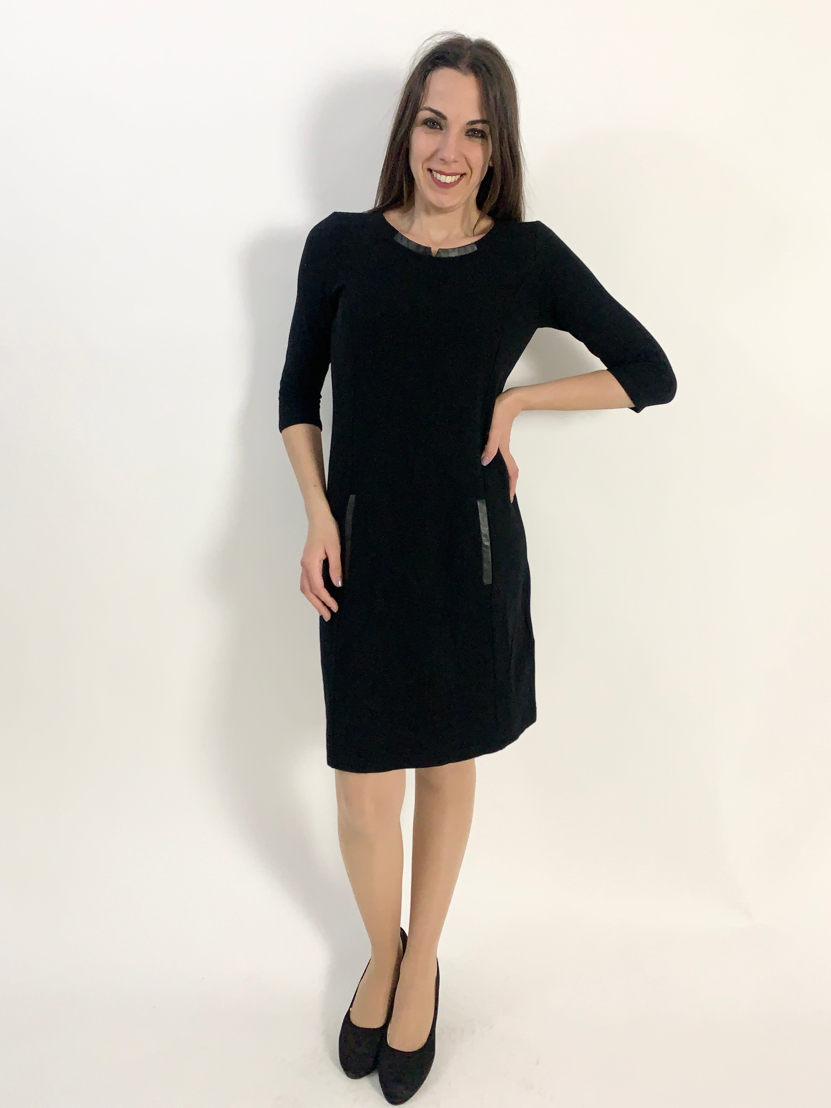 Delicato abito nero con fitta trama tono su tono molto elastico tg S/M con rifiniture in ecopelle misure:
