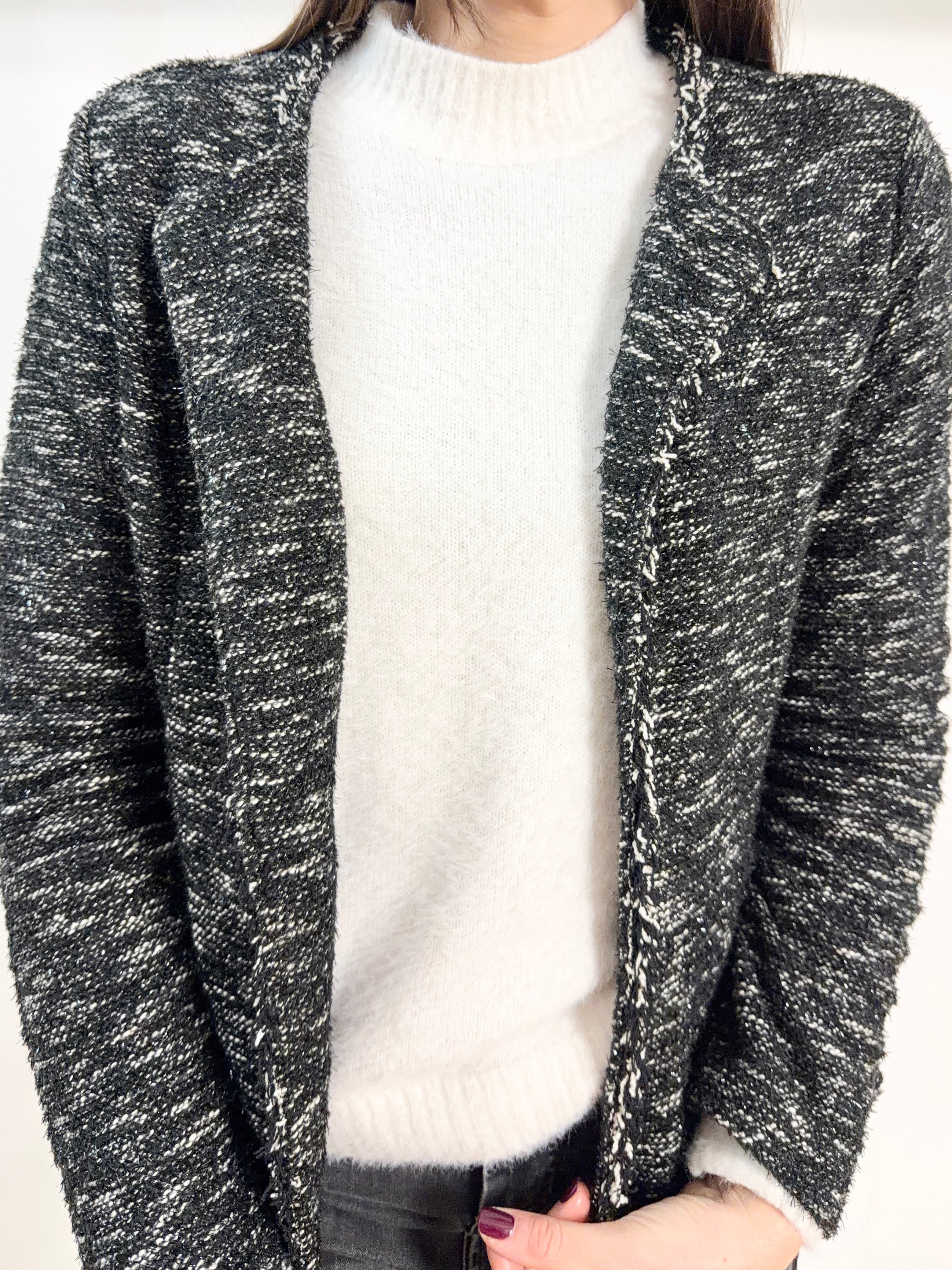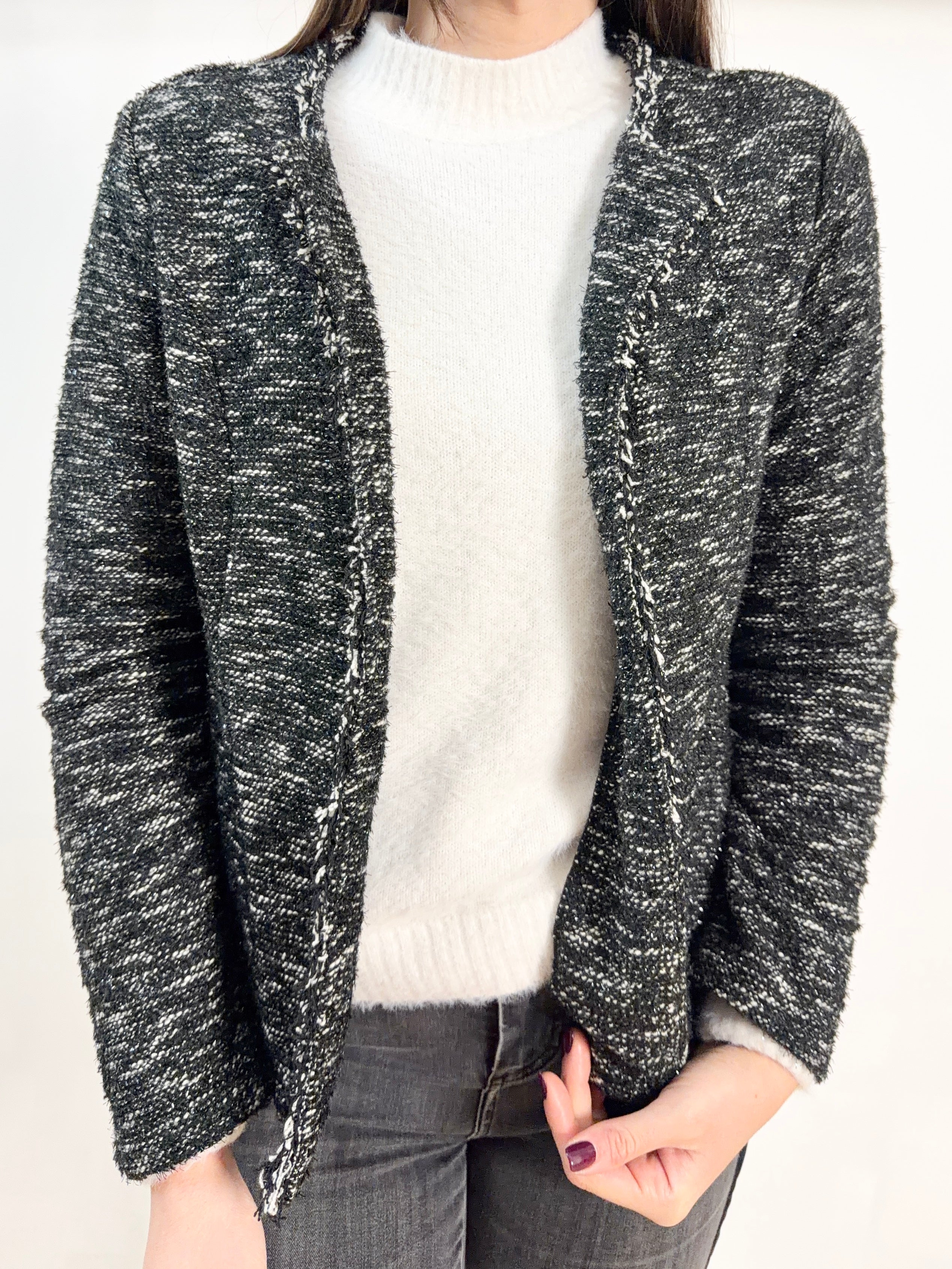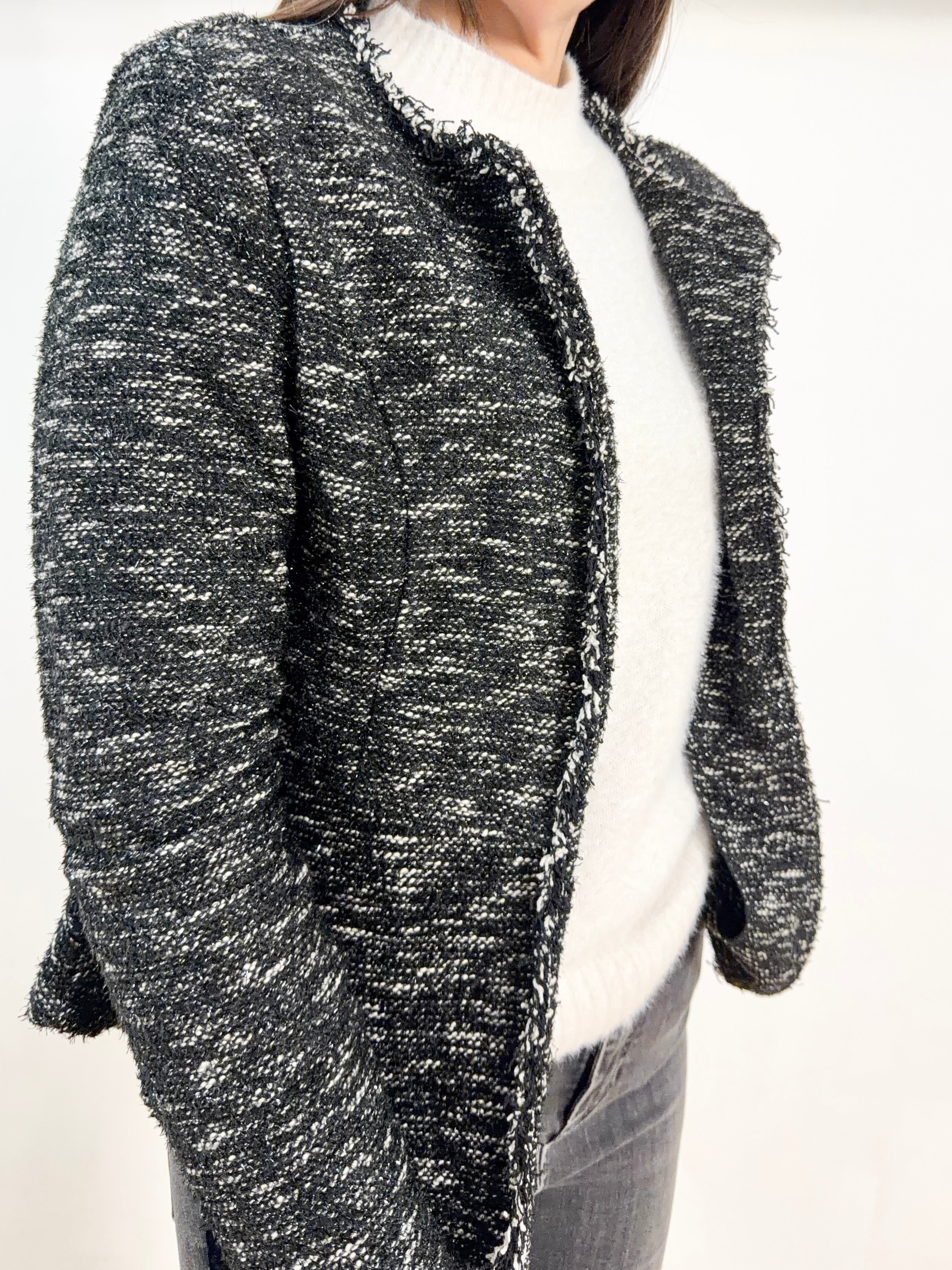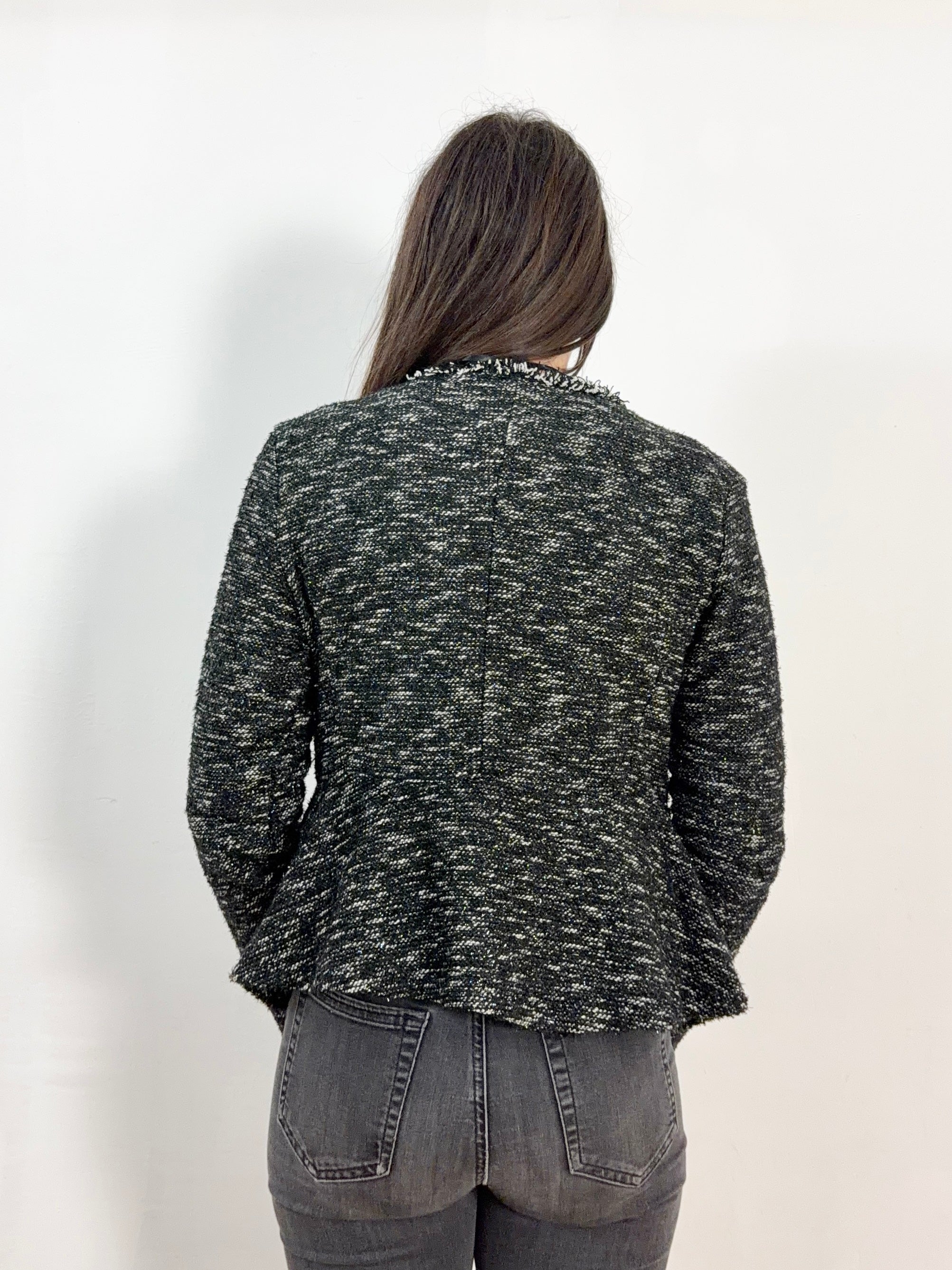 Graziosa giacca drappeggiata in tweed variante nera e bianca con annesso lurex tg S/M chic e delicata misure: