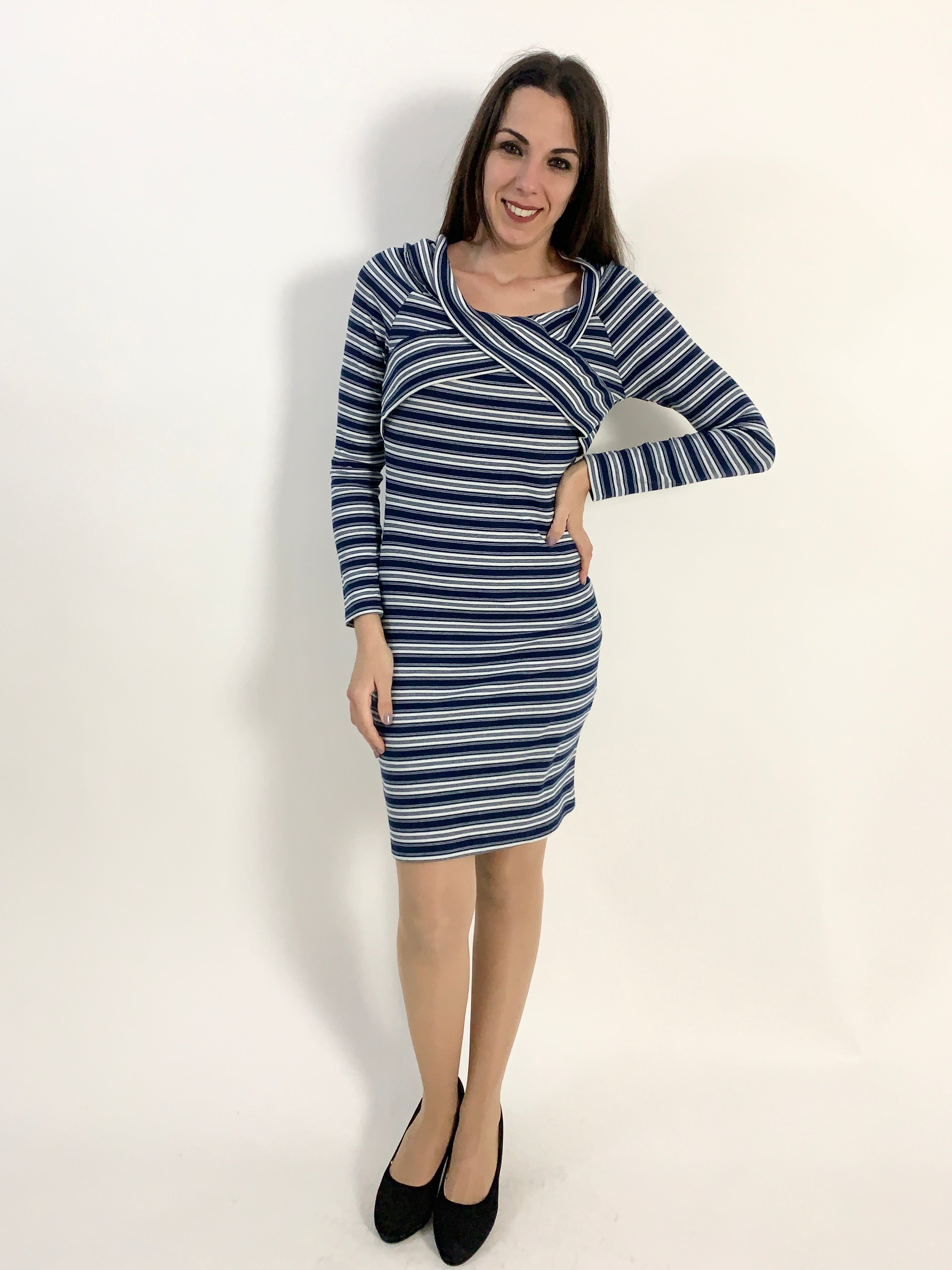 Grazioso abitino elastico a righine in morbida viscosa blu e bianco tg S/M misure:
